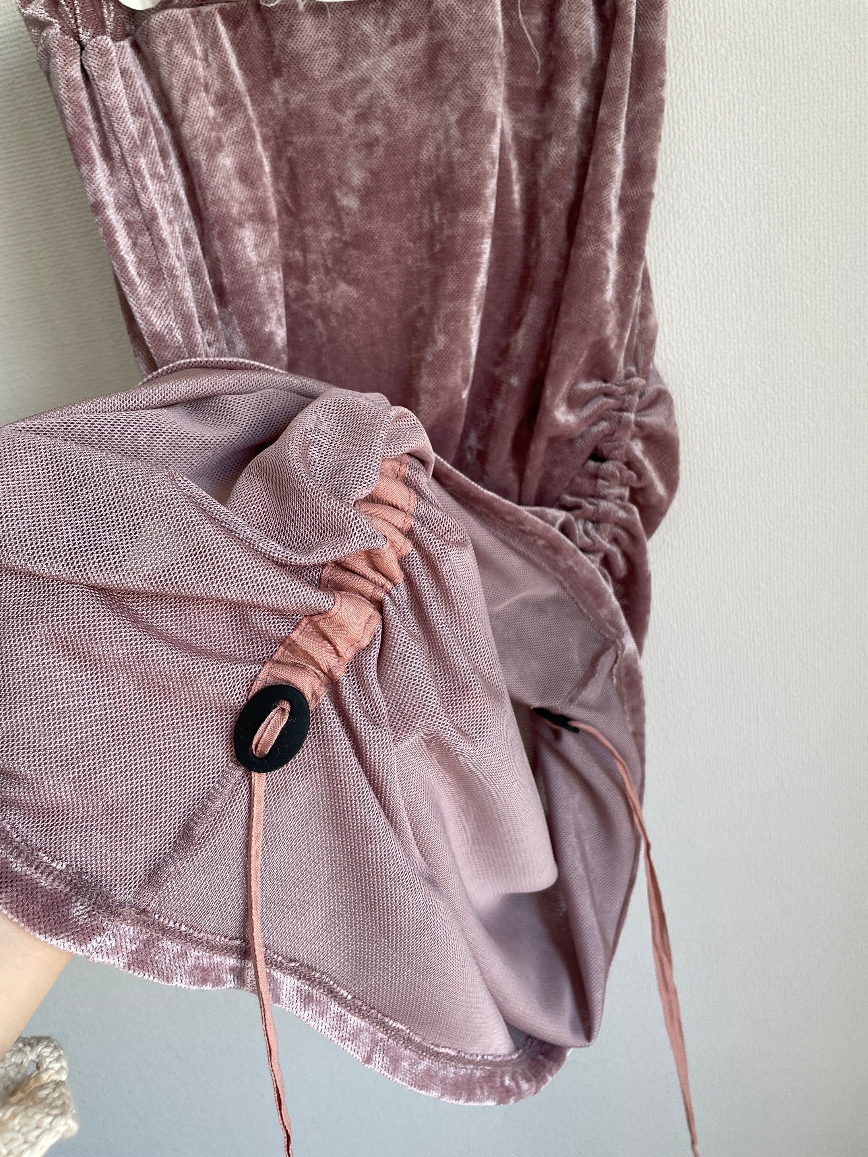 透け感がございますので、インナーとしてレギンスなどを着用していただいたり、パンツの上に重ねてのご着用をお勧めいたします。