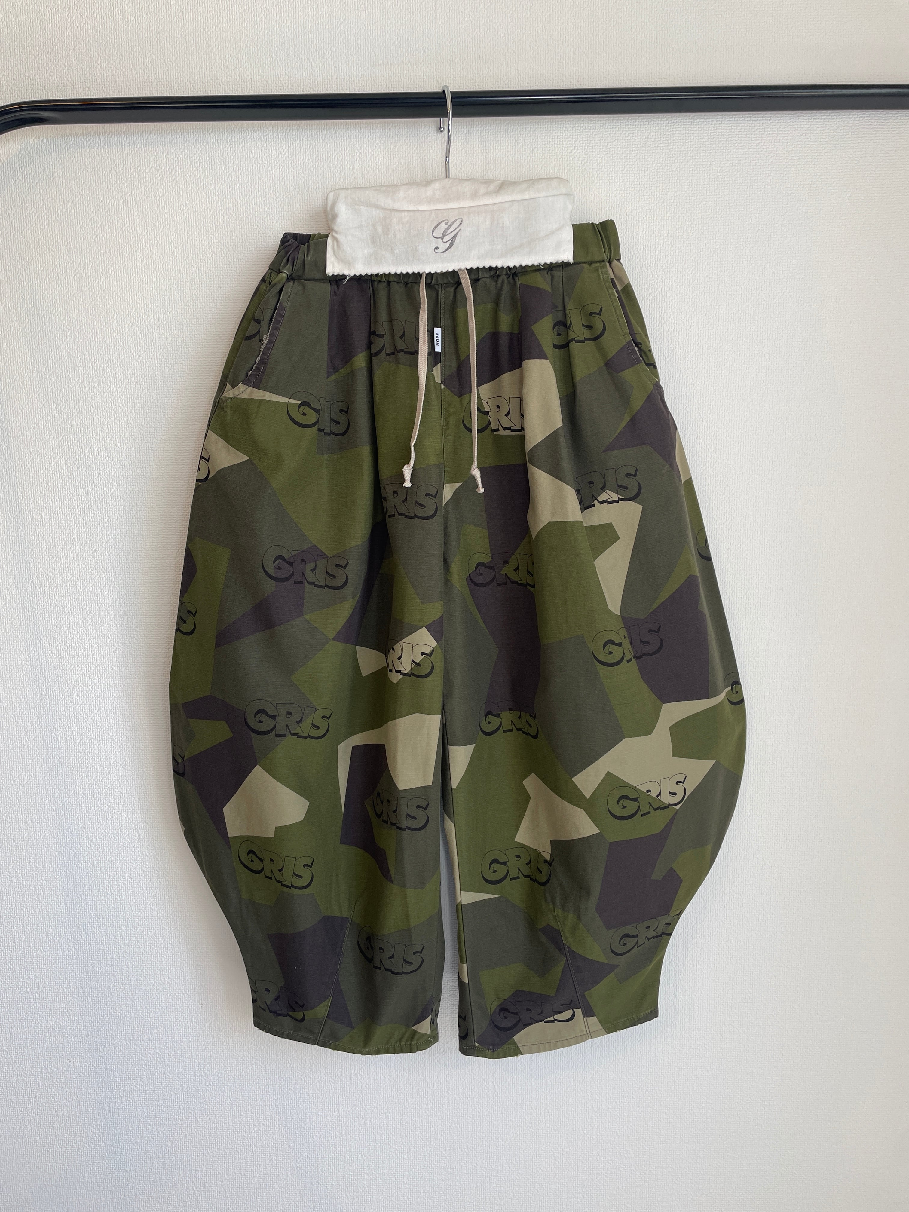 素材は、スウェーデン軍のカモ柄のバックツイルにGRISのオリジナルの総柄プリントを入れた生地を使用しております。
