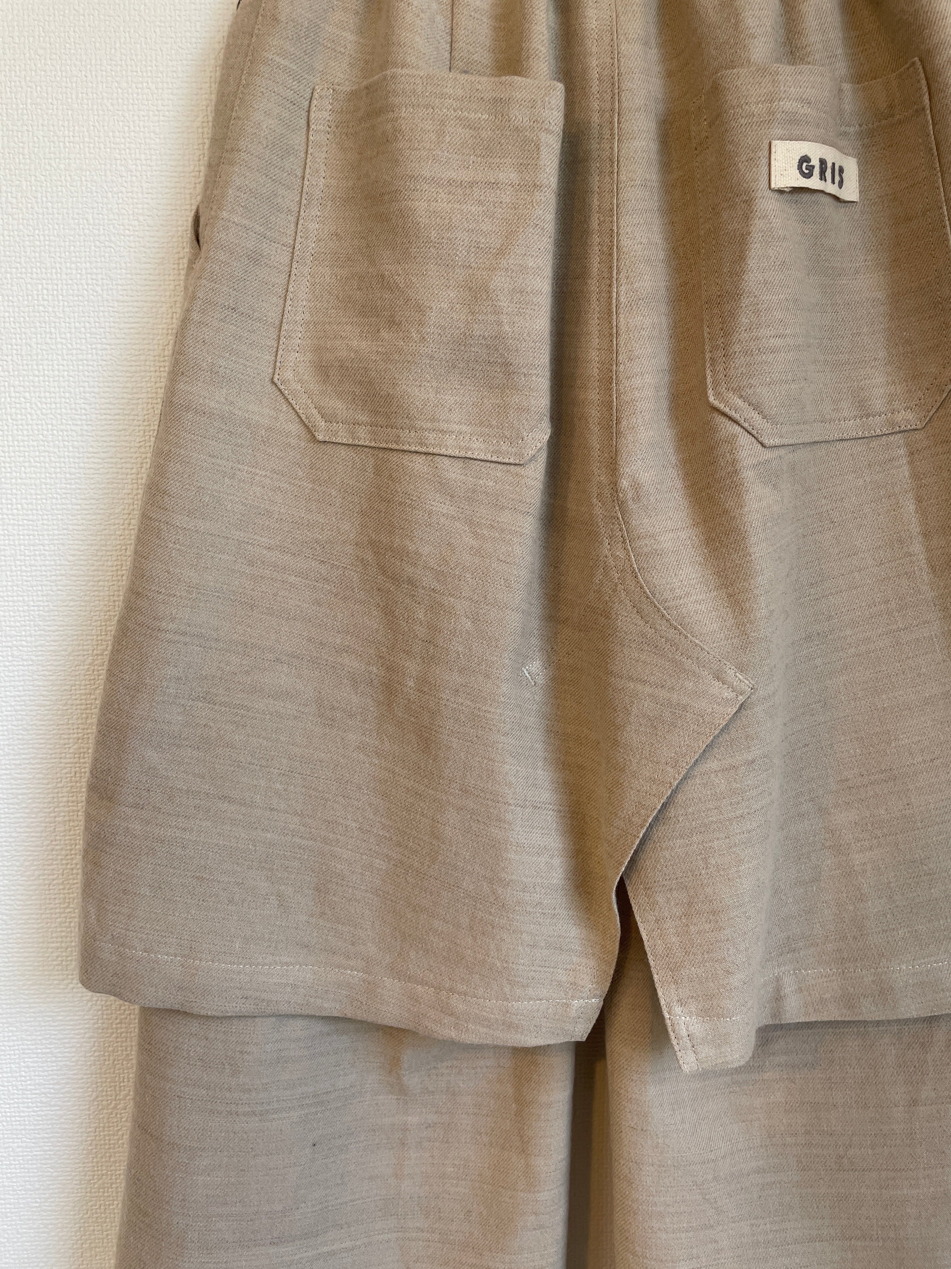 スカート部分のデザインにもこだわり後ろ見頃はパンツを切り開いてスカートにリメイクした様なデザインとなっております。